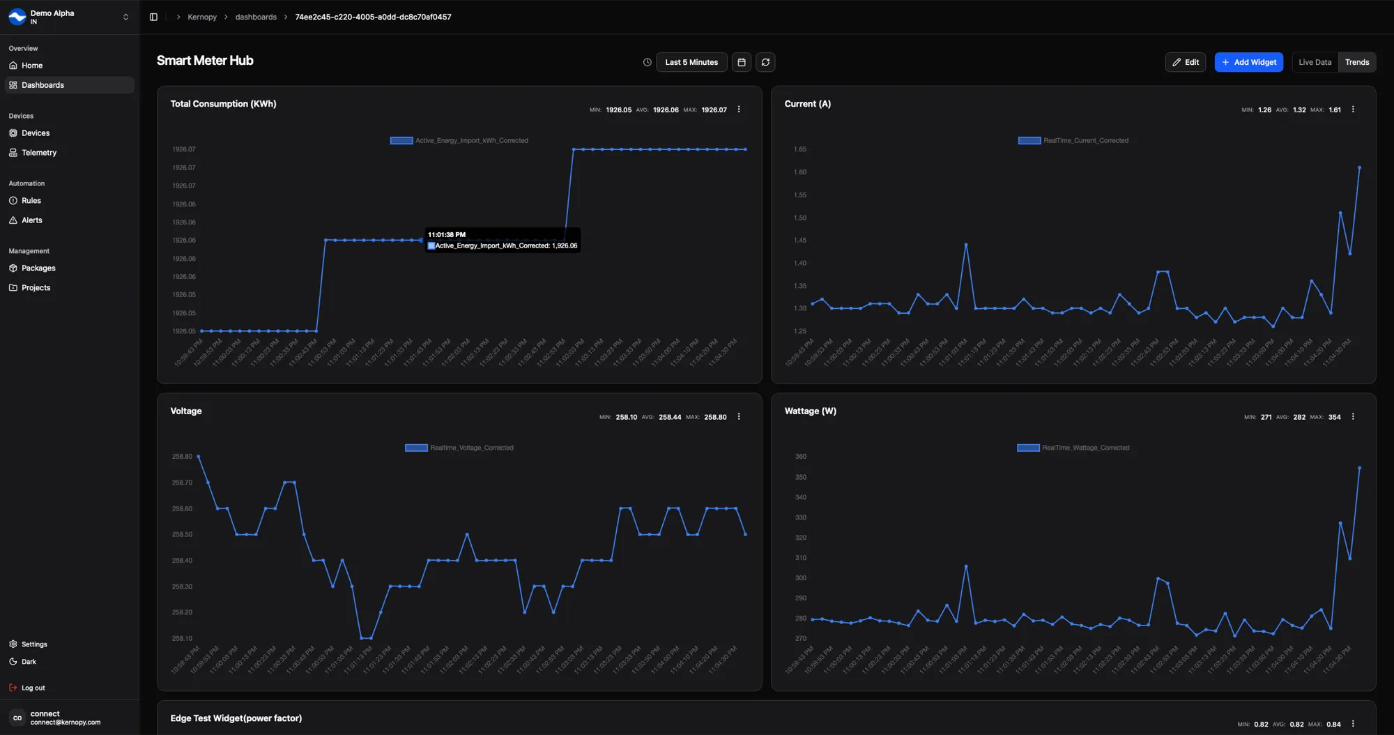 Every endpoint — sensors, meters, PLCs, and Edge Runtime nodes — is registered as a typed device. Edge nodes are first-class devices: visible in the same registry, carrying live health and connectivity status, configurable remotely.
